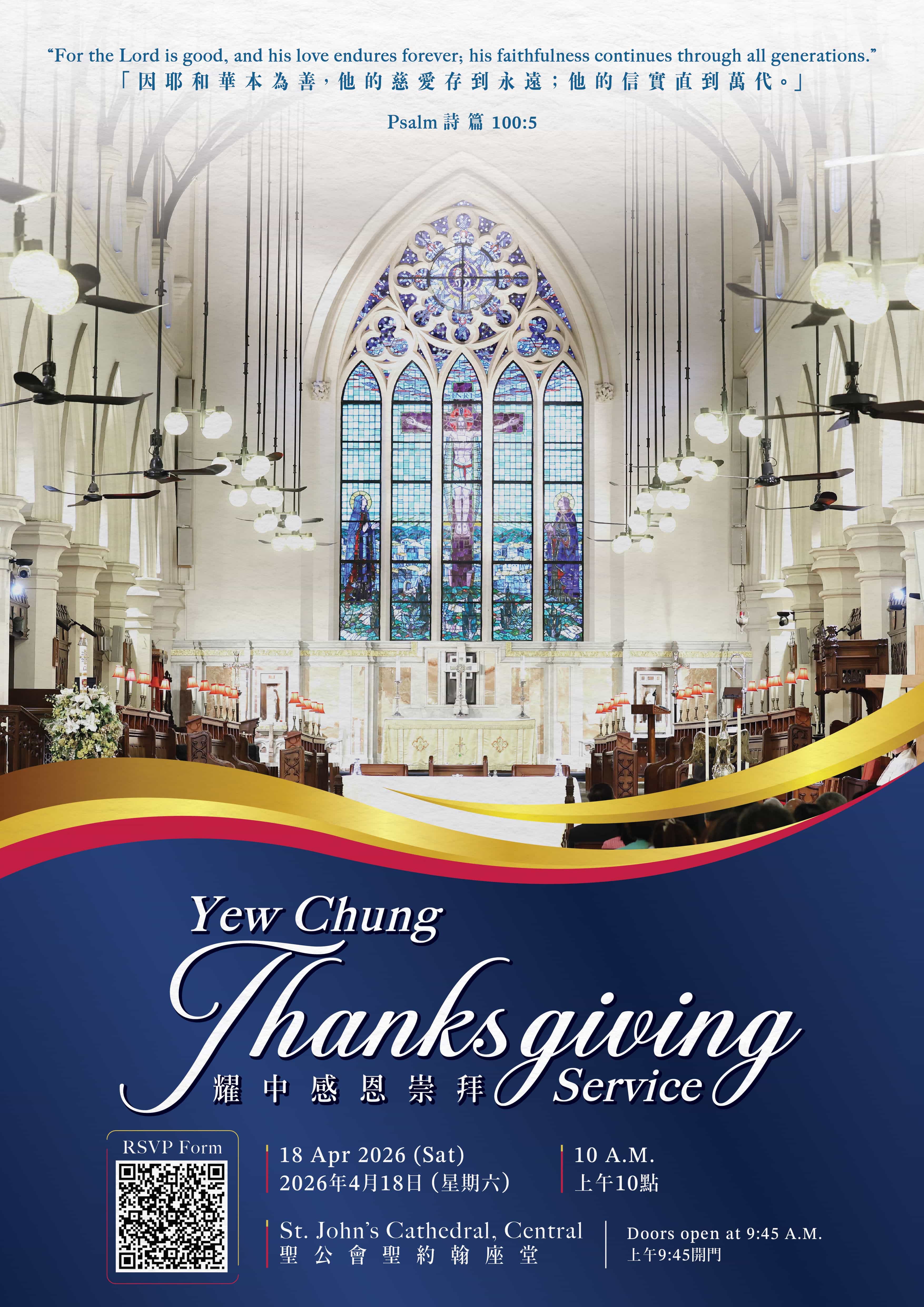 诚邀您预留时间,参与耀中感恩崇拜,让我们同心敬拜、数算主恩,一同纪念上帝亘古不变的信实。
