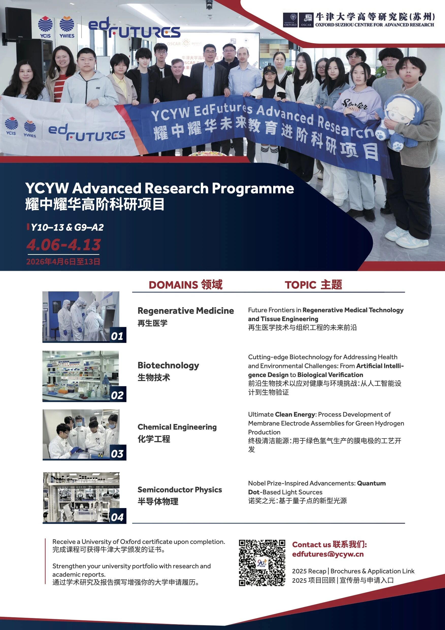 在前两届成功举办的基础上,2026年春天,耀中耀华再度携手牛津大学高等研究院(苏州)(OSCAR),推出新一期高中生高阶科研项目。学生将沉浸于世界一流的科研环境,深入参与前沿课题研究,并获得来自牛津大学学者、领域顶尖专家及耀中耀华未来教育(EdFutures)团队的全方位指导。