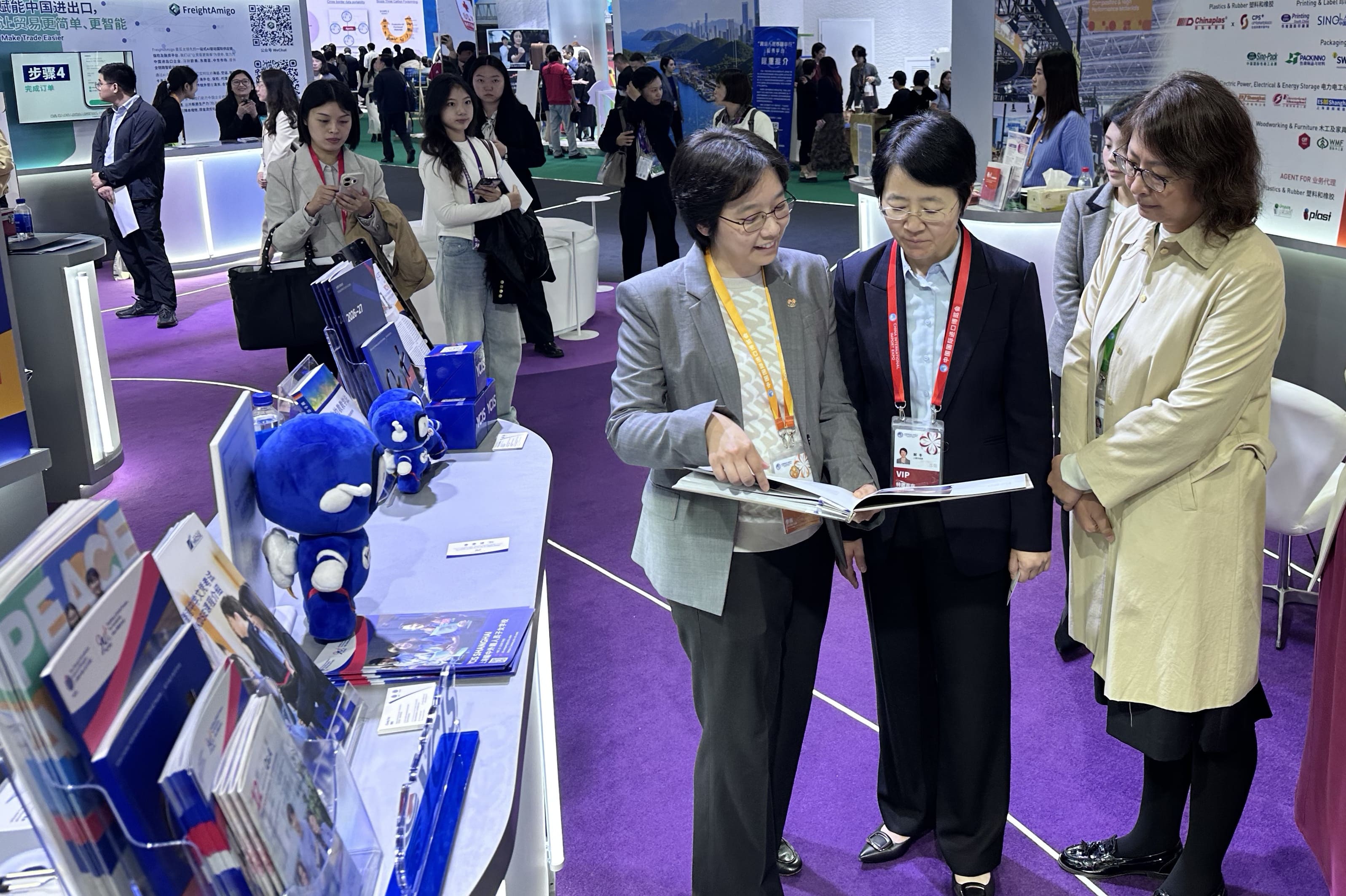 11月6日,在第八届中国国际进口博览会香港服务展区,耀中耀华教育网络行政副总裁(K-12)陈昕生博士向到访的上海市副市长解冬女士详细介绍了机构的发展历程与内地办学成果。首席学校运营官陈唯女士一同参与接待。