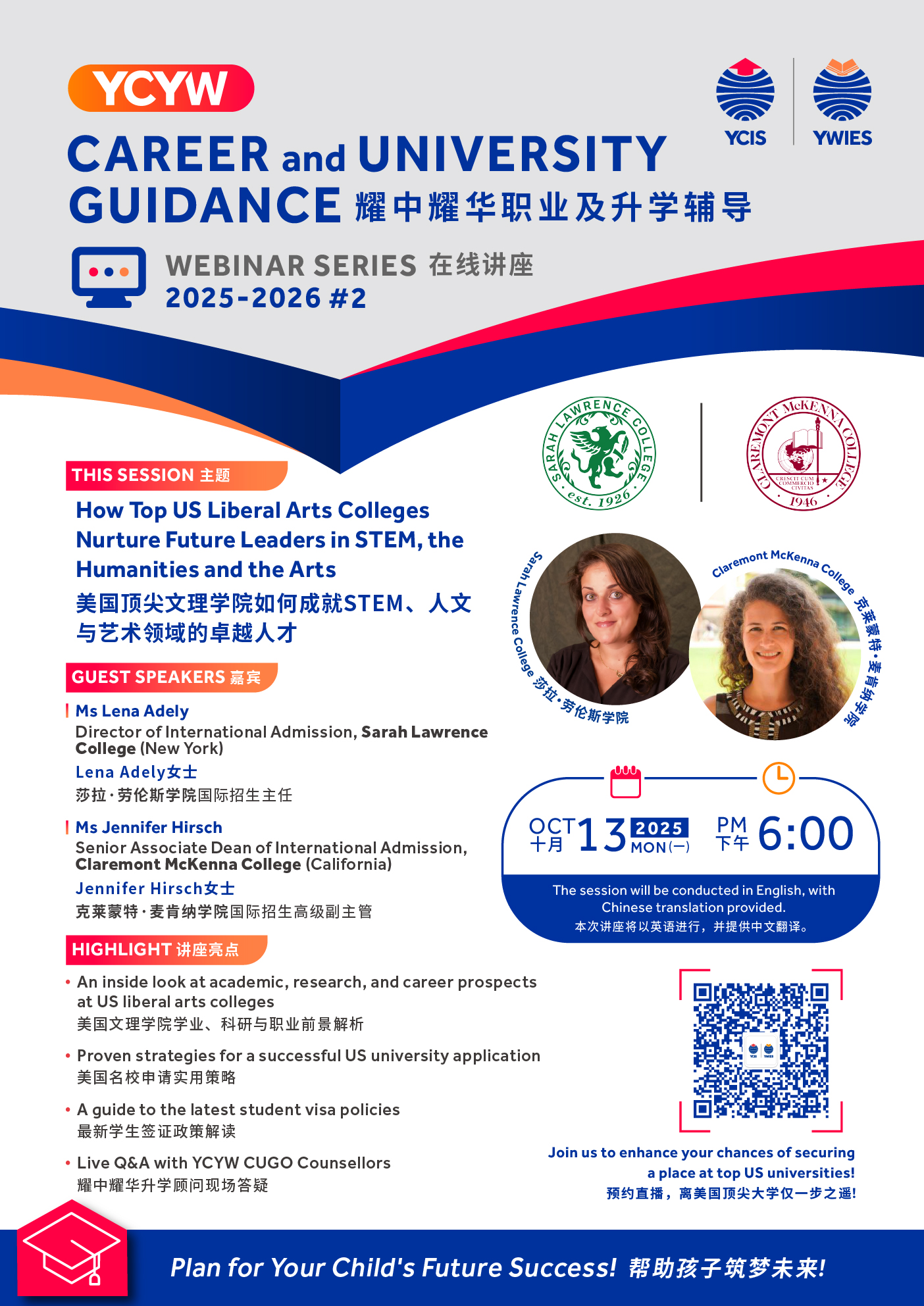 作为2025-2026年度耀中耀华职业及升学辅导在线讲座系列的第二场,我们荣幸邀请到两位美国顶尖名校的招生官——来自莎拉·劳伦斯学院(纽约)的Lena Adely女士 和克莱蒙特·麦肯纳学院(加州)的Jennifer Hirsch女士 ,为您揭秘文理学院如何培养在STEM、人文与艺术等各领域的卓越人才 。