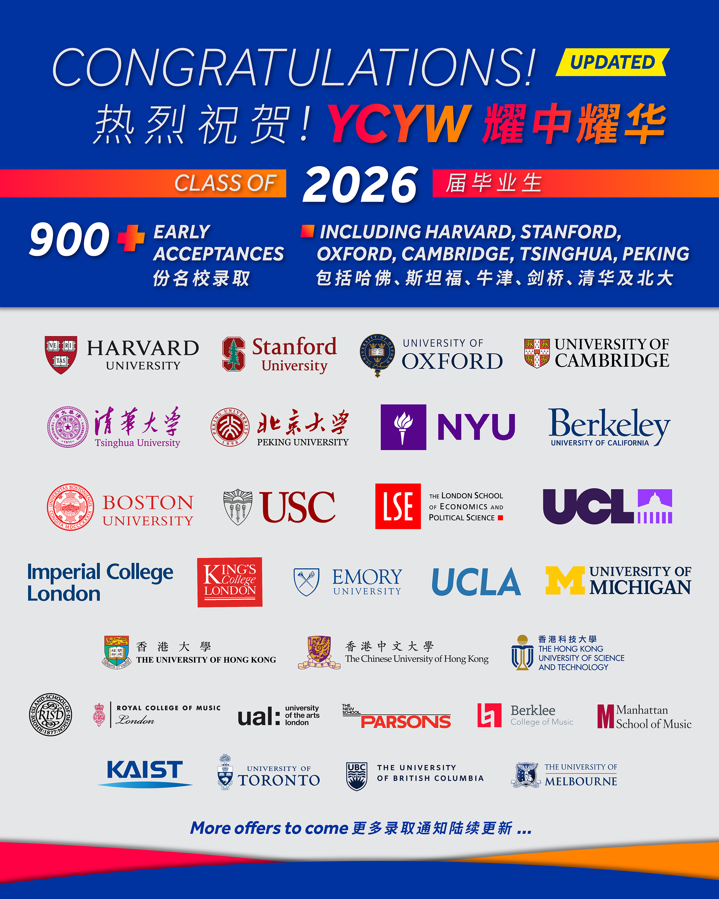 隨著全球高校 2026 年度錄取結果陸續公布,耀中耀華教育網絡公布最新升學成果。截至 2026 年 4 月,耀中耀華 2026 屆畢業生已累計收到超過900 份來自世界知名高校的錄取通知書,涵蓋美國、英國、中國內地、中國香港及亞洲、歐洲多個國家和地區,包括哈佛大學、斯坦福大學、牛津大學、劍橋大學、帝國理工學院、清華大學、北京大學、香港大學、韓國科學技術院(KAIST)以及帕森斯設計學院等全球頂尖學府。